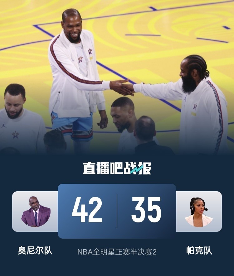 奥尼尔队:利拉德9分3板2助、库里8分6板1助、杰伦-布朗8分、塔图姆6分2板2助、杜兰特4分3板3助、欧文4分3板2助2断、哈登3分1板2助