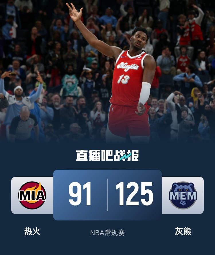 比赛开始,贝恩和JJJ里突外投带队迅速建立领先,热火打得很犹豫连续失误,小皮蓬接连三分拉开近20分领先,李凯尔勾手加三分止血,首节灰熊领先11分,次节热火替补发威打出12-4攻击波止血,但小皮蓬和肯纳德轮番送助攻,JJJ无敌手感半场砍下23分重新领先到15分。下半场,灰熊发力扩大领先,但阿德巴约接连三分命中砍下12分止血,随后贝恩有攻有传带队16-2攻击波直接领先到27分,末节灰熊继续发力一度拉开30分以上领先,最终灰熊125-91大胜热火,送对手7连败。
