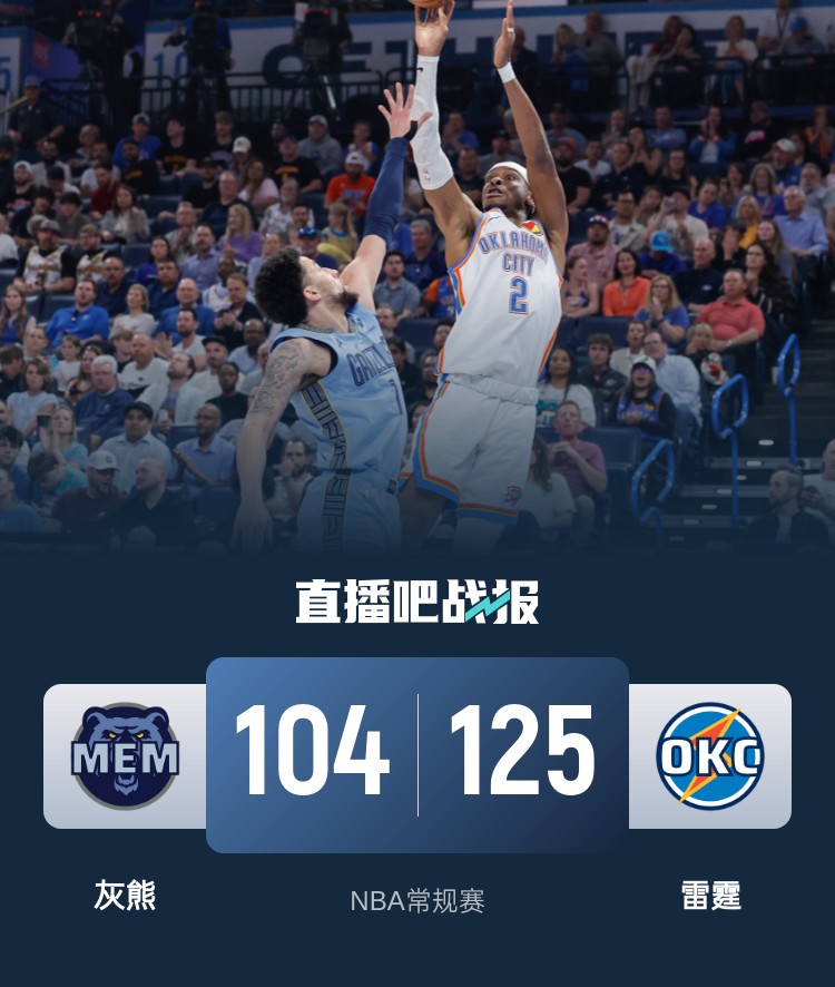 雷霆(61-12):亚历山大37分3板6助3断、杰伦威20分5板4助、哈尔滕施泰因18分11板4助2断2帽、华莱士10分3板2助、多特9分1板5助3断、肯威8分2板1助、乔7分4板2助、卡鲁索6分3板1助、霍姆格伦4分9板2助、杰林威3分3板、卡尔森3分、弗拉格勒1板、狄龙-琼斯1助。