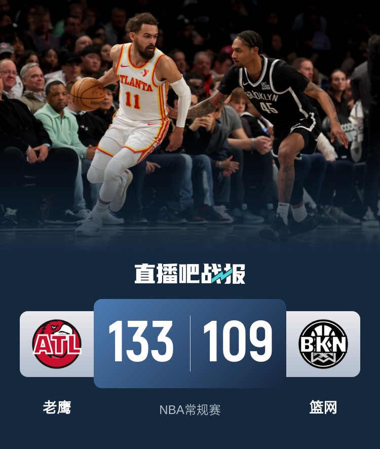 比赛上来,老鹰就打出10-1的开局取得领先,前半节的时间篮网只拿到4分,分差也是迅速达到了两位数,次节里萨谢继续自己的火热状态,单节得分再次上双,两节过后已经高效砍下23分,半场结束时篮网落后24分;下半场回来,篮网的进攻表现还可以,但是依旧无法限制对手的攻势,分差继续来到三十分,末节篮网虽然连拿8分止血,但是对比赛结果已经没有影响,最终老鹰大胜篮网拒绝连败。