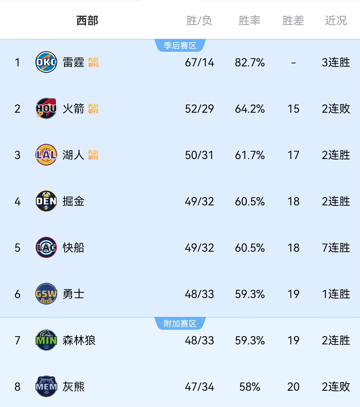 - 掘金(4)、快船(5)、森林狼(6)、勇士(7)、灰熊(8)