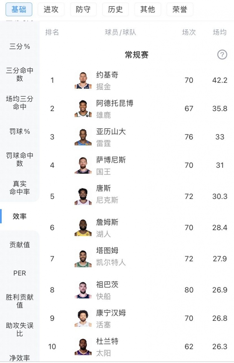 排在第4-10位的分别是塔图姆(26.8分8.7篮板6助攻)、米切尔(24分4.5篮板5助攻,上升2位)、詹姆斯(24.4分7.8篮板8.2助攻,上升1位)、库里(24.4分4.4篮板6助攻,下降2位)、康宁汉姆(26.1分6.1篮板9.1助攻)、唐斯(24.4分12.8篮板3.1助攻,新上榜)、爱德华兹(27.4分5.7篮板4.5助攻,下降1位)。