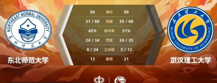 第四节,双方均选择冲击内线,东北师大稳扎稳打保持5分左右领先,付典钦飙中三分,武汉大学持续发力打出9-2的攻击波缩小分差,关键时刻付典钦两罚全中扳平比分,徐鸣阳三罚全中后付典钦打成2+1再度追平,东北师大连续打铁失误,王鹏翼4罚3中杀死比赛。最终,武汉理工大学99-94力克东北师范大学。