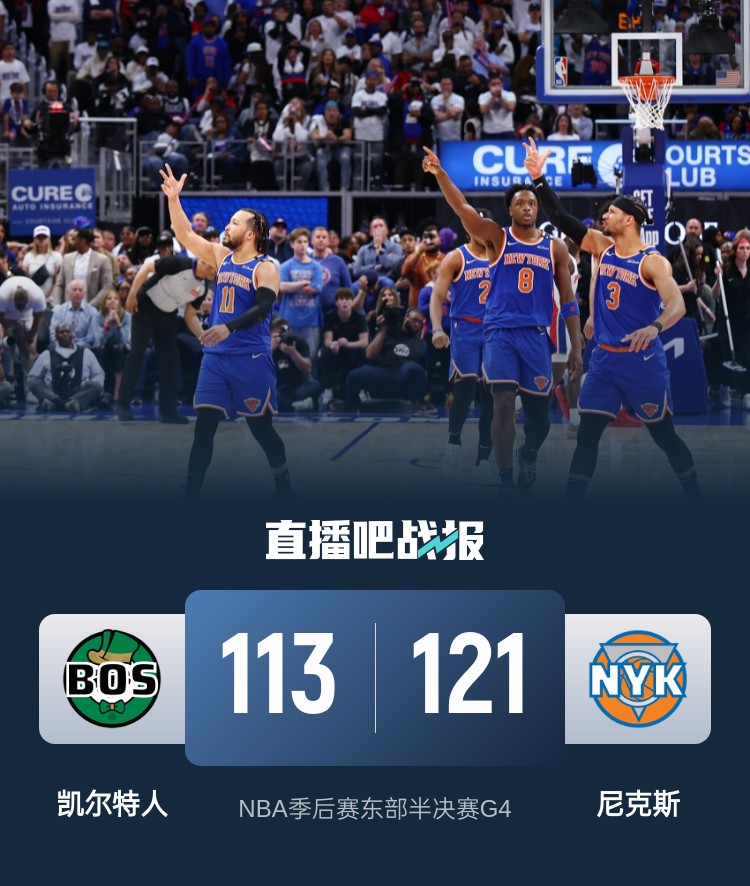 比赛开始,怀特上来连中3记三分,凯尔特人打出13-4不错开局,布里奇斯和布伦森连续外线回应11-0一度反超,但最后1分半塔图姆连扔3记三分再次轰12-0建立双位数领先,次节尼克斯7-0止血,但绿军迅速回应9-0,麦克布莱德和阿努诺比三分追分,双探花联手能回应,半场绿军继续领先11分。下半场,双方继续拉锯战,布伦森里突外投连砍8分追分,随后布伦森继续发力单节砍下18分终于带队反超比分,末节哈特5犯被迫被换下,塔图姆连续三分再进又反超,双方比分持续胶着,随后布伦森和布里奇斯连续硬解进球领先到7分,塔图姆无对抗受伤离场,布伦森三分再进杀死比赛,最终尼克斯121-113逆转凯尔特人,大比分3-1夺赛点。