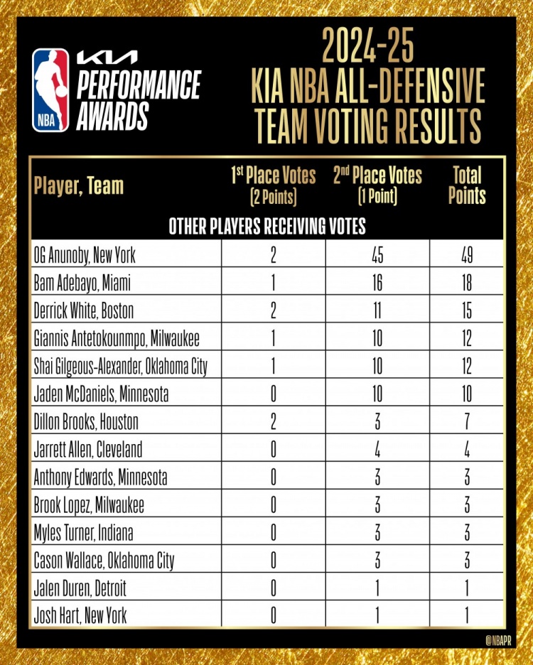 贾勒特-阿伦获得4张第二选票,总得分4分。