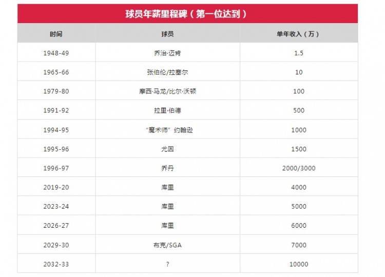 再过4年就有7000万年薪了,NBA离单年收入一个亿的还有多远?据估算只需要过7年,只要NBA的工资帽按今年这样10%的幅度上涨,那么到2032-33赛季,将会出现第一位年收入一亿的球员。