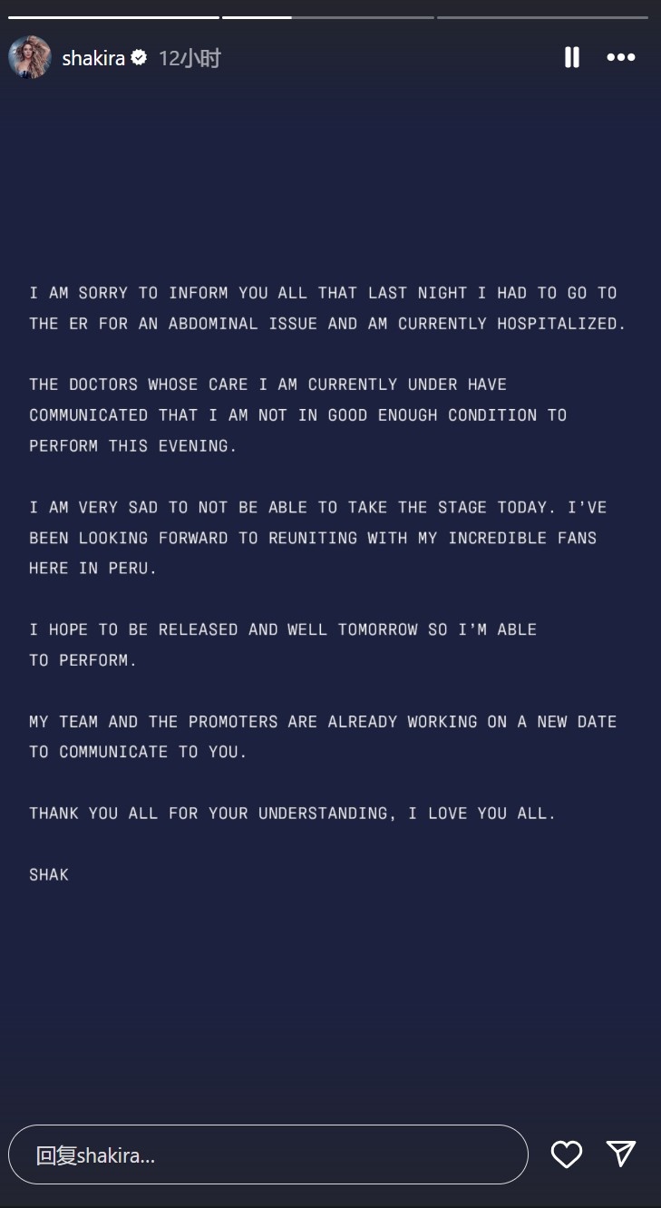 2月17日讯 48岁的夏奇拉因腹痛不得不入院接受治疗,秘鲁演唱会无法如期进行。夏奇拉目前正在美洲进行巡演,宣传其七年来的首张新专辑《Las...
