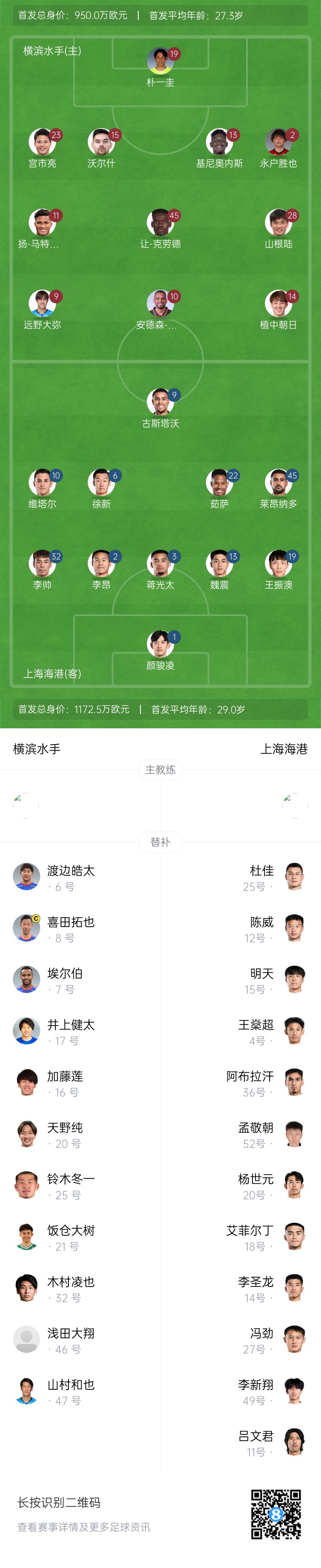03月11日讯 北京时间18点,亚冠精英联赛1/8决赛东亚区次回合,上海海港客场挑战横滨水手,赛前官方公布两队首发阵容。