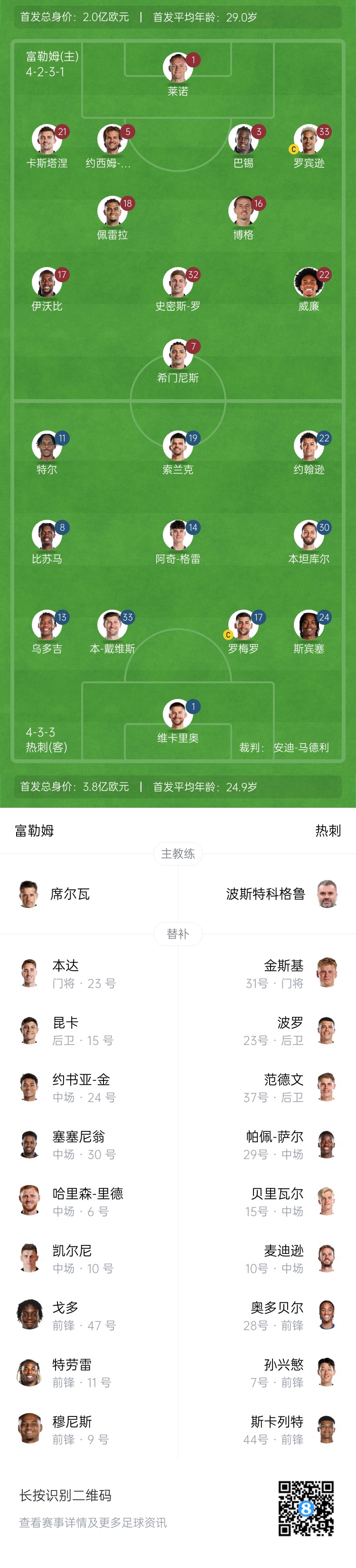 富勒姆替补:23-本达、30-塞塞尼翁、15-昆卡、6-哈里森-里德、10-凯尔尼、24-约书亚-金、47-戈多、11-特劳雷、9-穆尼斯
