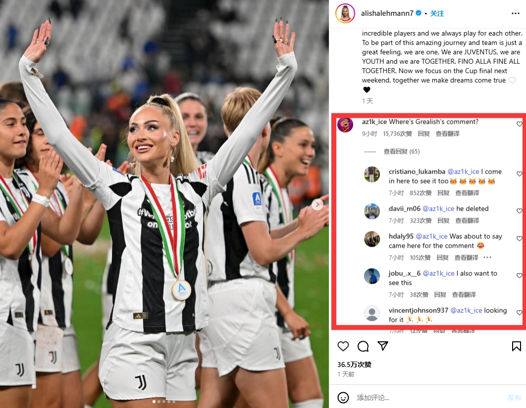 今日在网络上流传一张截图,内容为尤文女足球员莱曼庆祝球队夺冠的社媒,格拉利什出现在评论区:“母亲节快乐”,莱曼回复:“我不是一个妈妈,但谢谢”,随后格拉利什又回复:“我可以改变(你不是一个妈妈)这件事”。