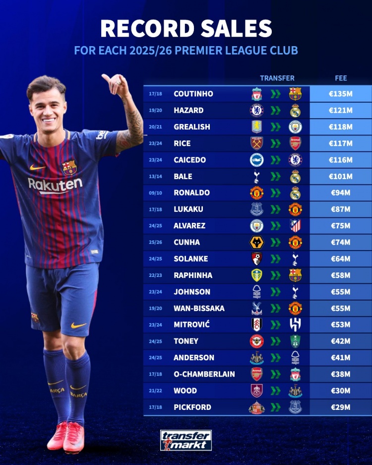 6月10日讯 德国转会市场盘点了2025-26赛季20支英超参赛队伍的历史最贵球员出售纪录,库蒂尼奥的1.35亿欧元至今仍排第一。