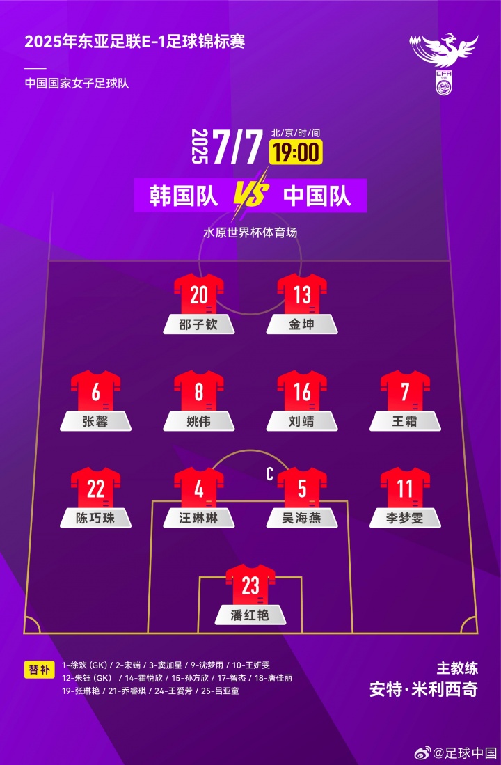 韩国女足首发:21-金珉贞、4-卢贞英、5-高瑜珍、16-张瑟琪、20-金惠莉、7-李金玟、14-郑敏英、10-池笑然、23-姜綵林、15-全佑静、9-文恩珠