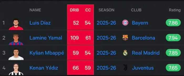 Statmuse数据统计,在本赛季欧洲五大联赛中,能够同时达成50次以上过人成功和创造50次以上机会的有以下四位球员: 迪亚斯:52次成...