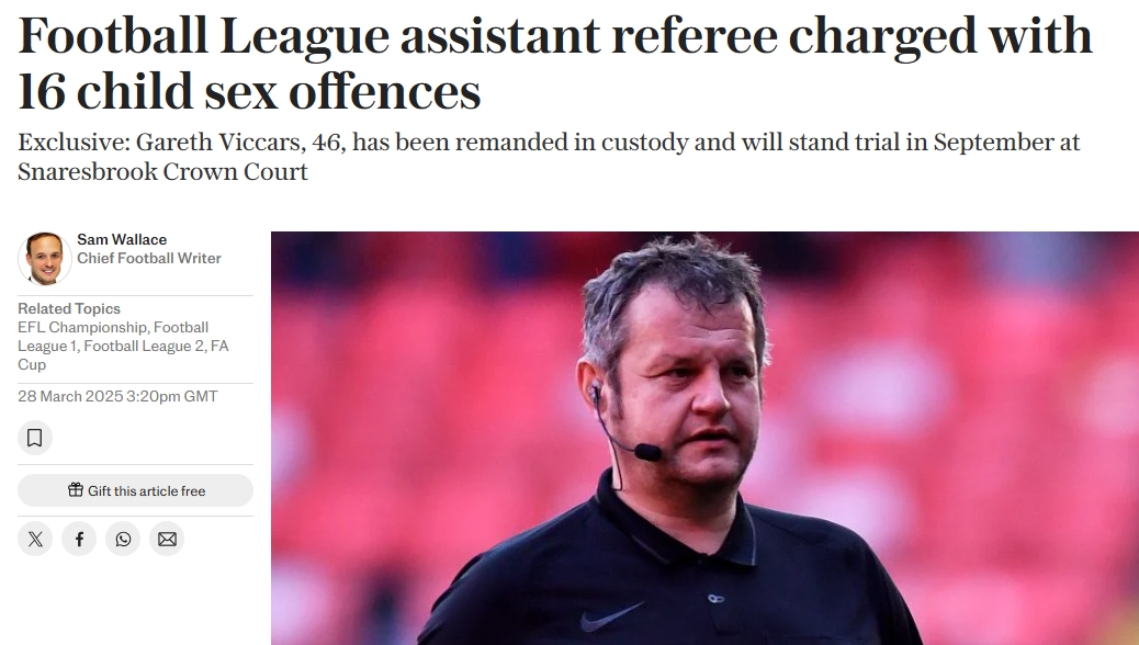 03月29日讯 电讯报独家消息,46岁的英国裁判被指控16项儿童性犯罪,目前已被羁押,他将于今年9月受审。46岁的加雷斯·维卡斯是一名边裁,...